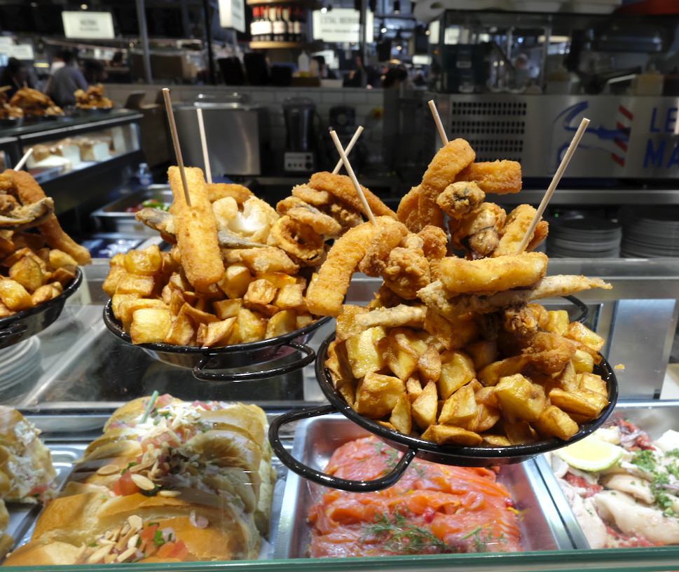 In den Hallen von Bacalan: alles voller Leckereien - saure Fish'n'Chips und süße Canales, lecker angerichtet. AK © 2025
