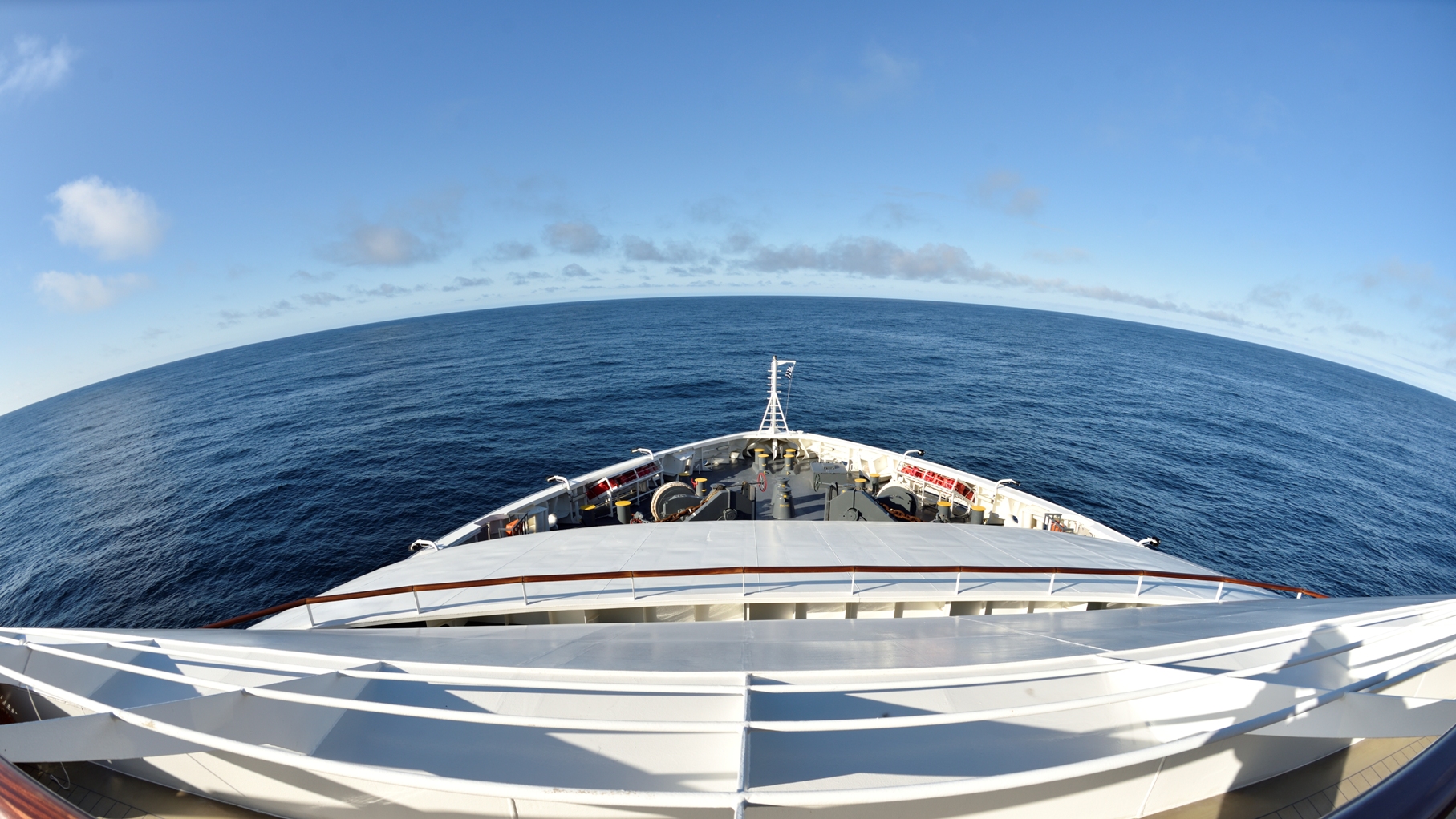 Vom Deck 6 sieht man bei 16mm Superwide/Fisheye von der Dünung nix mehr, das Schiff liegt wie ein Brett unter strahlend blauem Himmel... AK © 2025