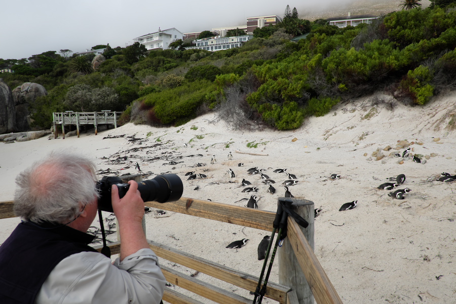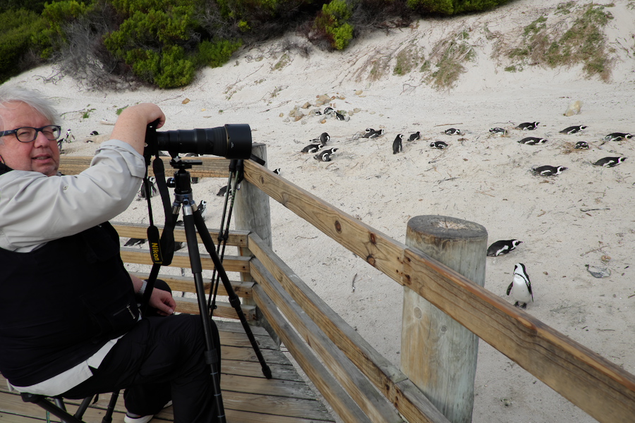 Wir sind vom 17.-21.3. im Protea Hotel (by Marriott Cape Town) Waterfront Breakwater Lodge und machen vom 17. bis zum 19.3. Tagesexkursionen. Gebucht hatten wir auf Anraten von Freund K-W Schulte bei http://www.Africascout.de. Der Mittwoch war geplant für 8:00 am Boulders Beach, was dank Fahrer und Guide Heiko Schulze auch prima geklappt hat. So früh hatten wir die Pinguine fast 1,5h ganz für uns allein. Konnte mein Stativ und den Hocker aufbauen und in aller Ruhe Fotos machen. Wenige Kurzzeit Zuschauer störten dabei nicht. Erst als um 9:45 die erste Bustruppe und dann noch eine sehr disziplinierte Grundschulklasse ankam, wurde der Platz eng. Wir haben dann um 10:00 eingepackt und waren um 700 Fotos bereichert.