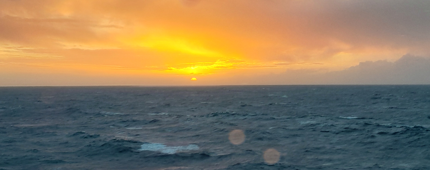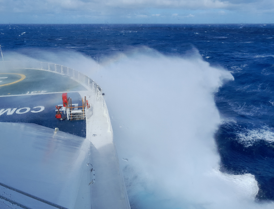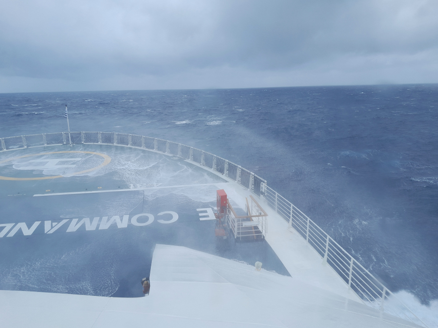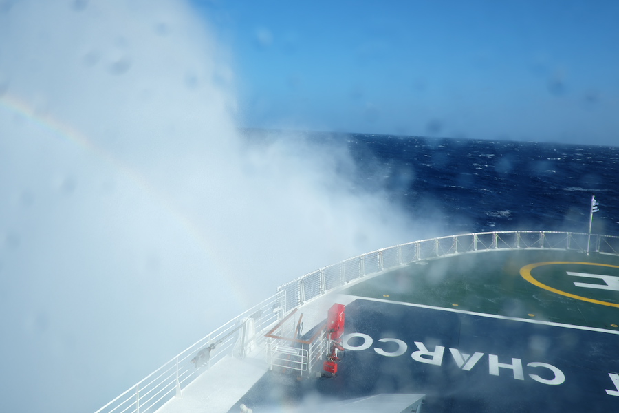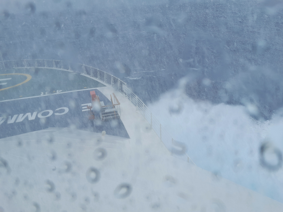 10.3. : Immer noch Sturm, die unruhigste Nacht bislang auf der Charcot, bezogen auf alle Reisen. Wellen von halb Steuerbord, Wind von halb Backbord, sagte der Kapitän. Abends haben wir einen sehr schönen Tisch mit Elsa und Remi sowie einem lettischen Ehepaar. Da wir morgen früh rausmüssen - wir erreichen ganz früh die Crozet Inseln - wird der Absacker an der Bar auf später verschoben. Wir machen drei Tage nur 11 Knoten Fahrt, was uns mindestens einen zusätzlichen Seetag beschert