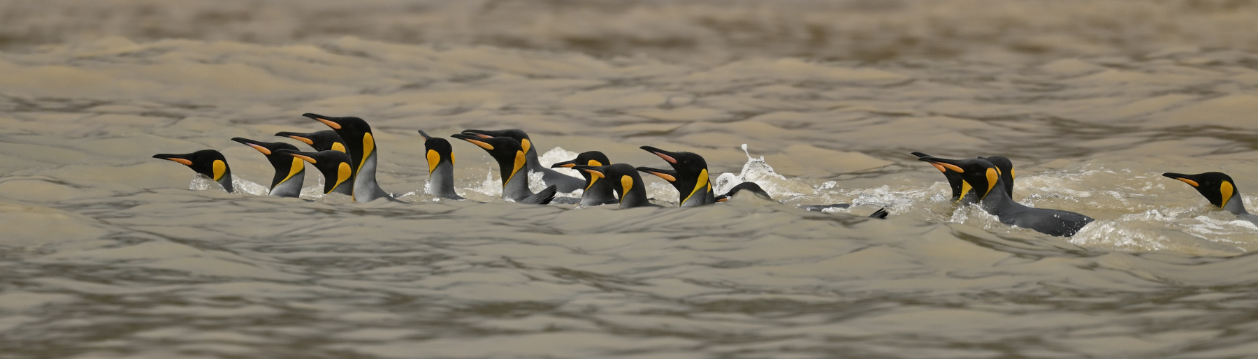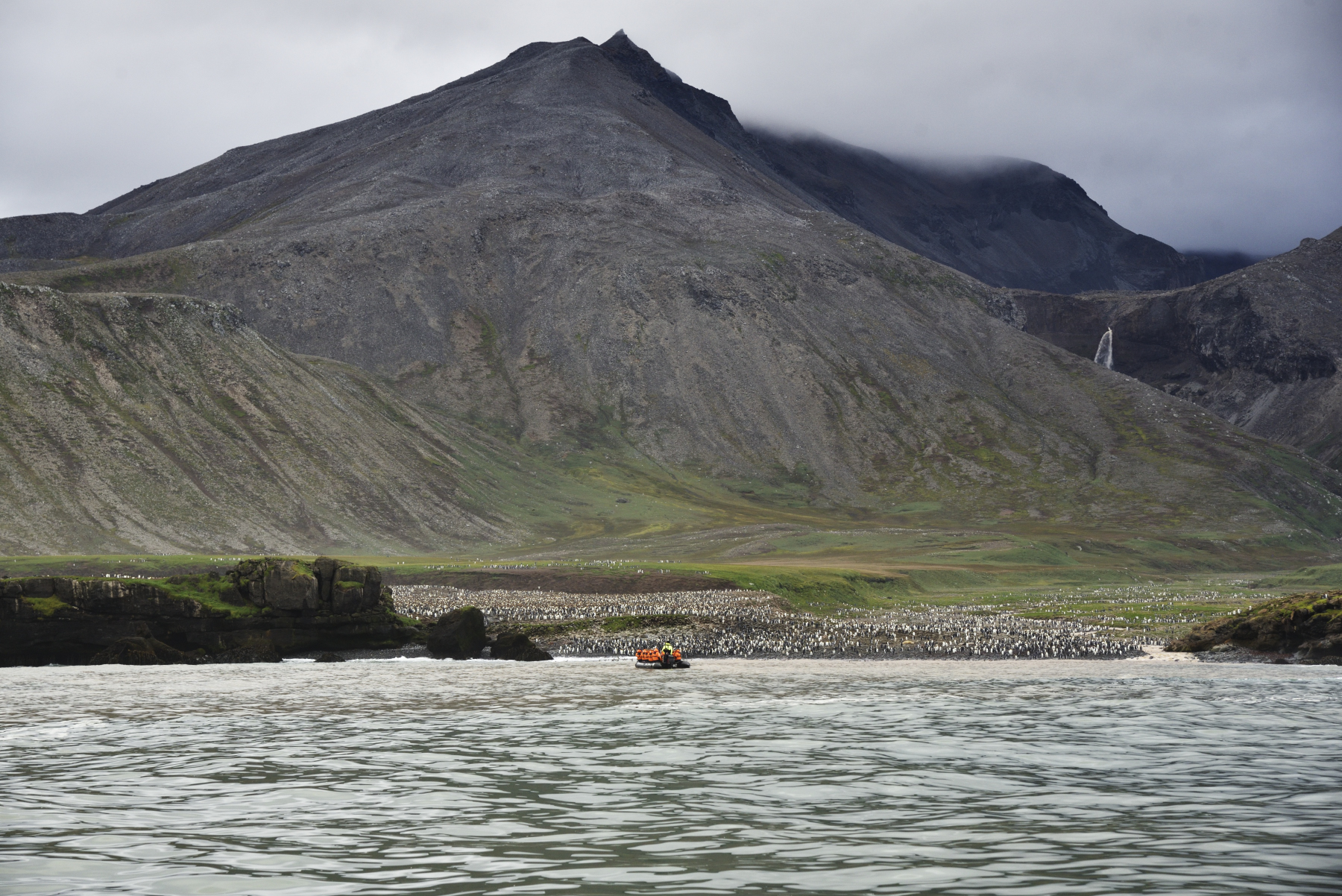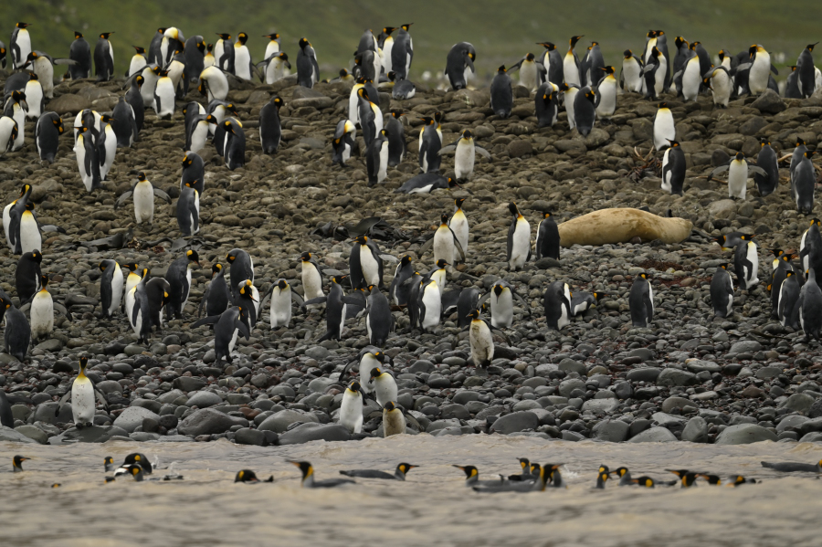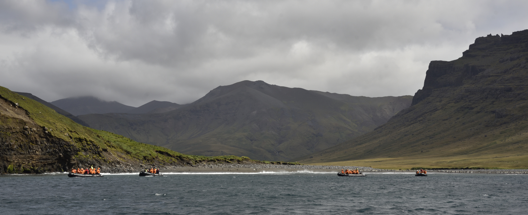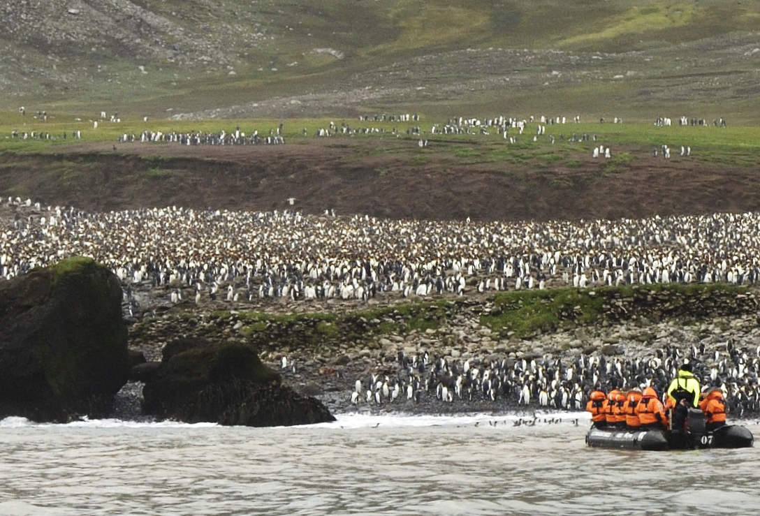 Crozet - In der Baie Americaine fahren wir gemütlich Zodiac. Ganz rechts am Strand stehen die Junggesellen der Königspinguine