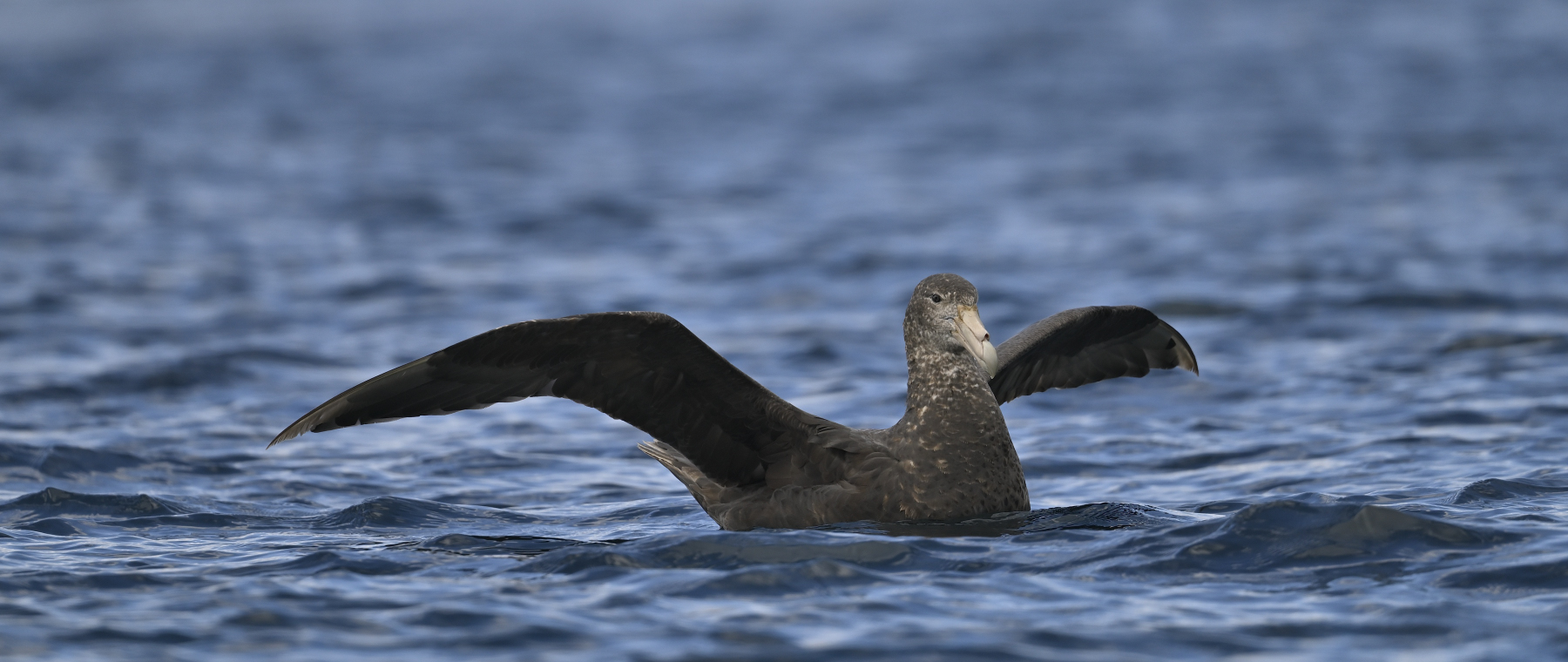 Riesensturmvogel im Tiefflug über dem Meer. Wanderalbatrosse brüten hier an Land und sind daher zahlreich in der Luft vertreten.