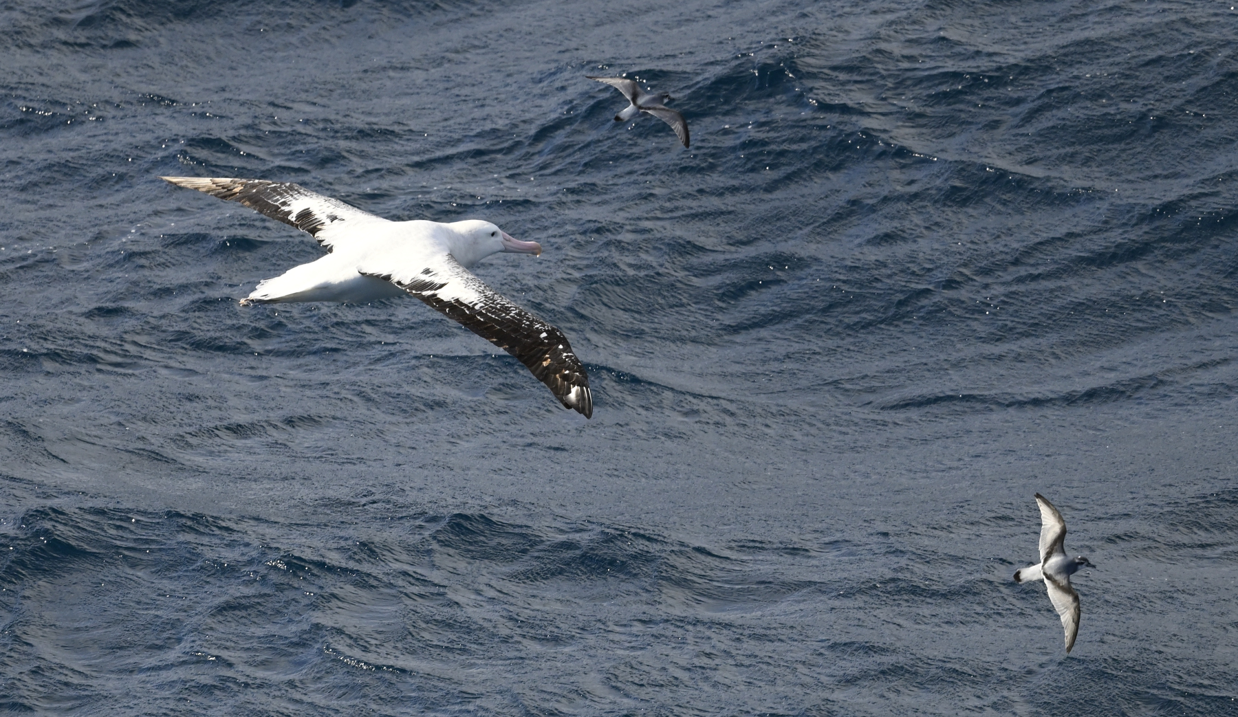 500 km nördlich von Crozet sehen wir die letzten Albatrosse, die unser Schiff begleiten (13.3. vormittags). Oben: zwei Schwarzbrauenalbatrosse (Mollymauks). Unten: Wanderalbatros mit zwei begleitenden Walvögeln.