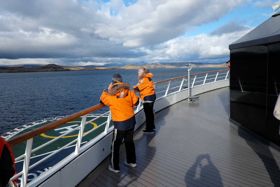 17.2.: Tag eins der Schiffsreise - Im Hafen müssen wir erst durch den Zoll wegen der Ausreise. Einschiffung für 196 Paxe ab 16:00. Das Wetter wird immer toller, jetzt sind es schon 30°C - wir schaffen nachmittags die 33°, sagte unser Taxifahrer. Um 17:00 ein kühler Drink in der Bar auf Deck 9. 17:30 Sicherheitseinweisung obligatorisch für alle. 19:15 ablegen, jetzt regnet es und die Sicht ist nix mehr für Fotos, schade. 19-20:00 Wir essen zu Abend. Prima das Beef Wellington und dazu ein kühles Bier. 20:00 Parkas anprobieren. 20:15 Noch ein Helles an der Bar Deck 9, um den Flüssigkeitsverlust des Tages auszugleichen. 21:30 Dusche und Bett. Sobald wir von der Küste wegkommen, so gegen Mitternacht, fahren wir in einen ehemaligen Sturm mit 5m hohen Wellen hinein. Wir räumen vor dem Schlafen gehen alles weg, was umfallen könnte. Die Außendecks und Balkone werden geschlossen...
