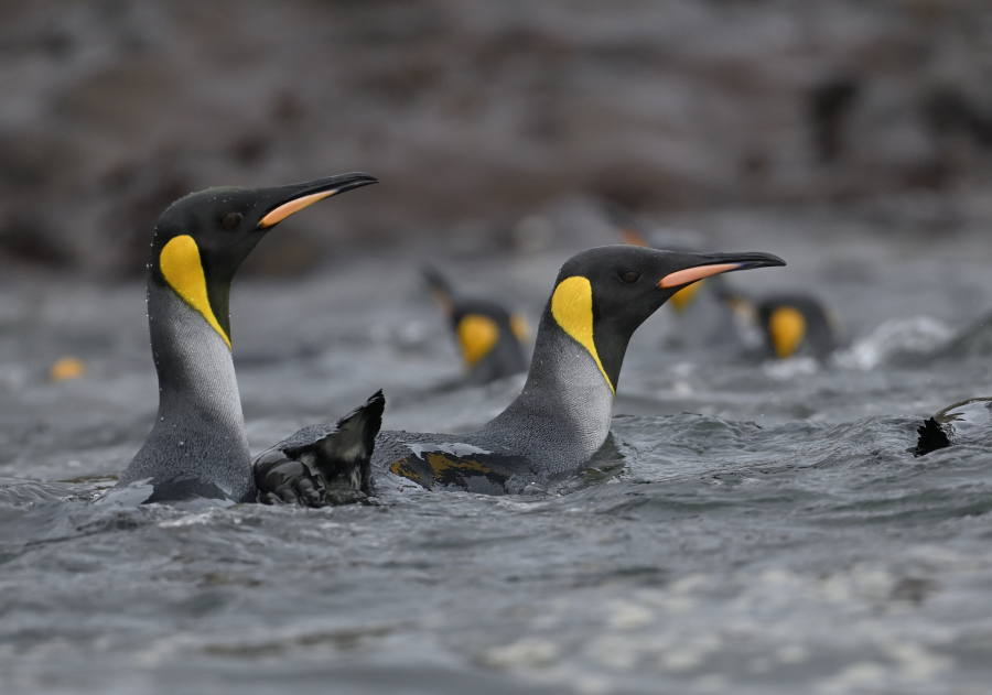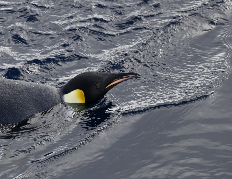 8.3.: 5:25 vor Sonnenaufgang auf dem Weg zur Larose Bay. Morgens um 7 ist die Welt noch in Ordnung, aber das Licht ist noch nicht so gut. Als wir um 8:30 starten, ist es viel besser. Geologe Harry macht mit uns die beste Zodiactour der ganzen Reise! Saint Annes Finger ist unser Wegweiser, dort befindet sich eine große Kolonie Königspinguine, die neugierig wie sie nun einmal sind, auch gleich bis zum Schiff heraus schwimmen.