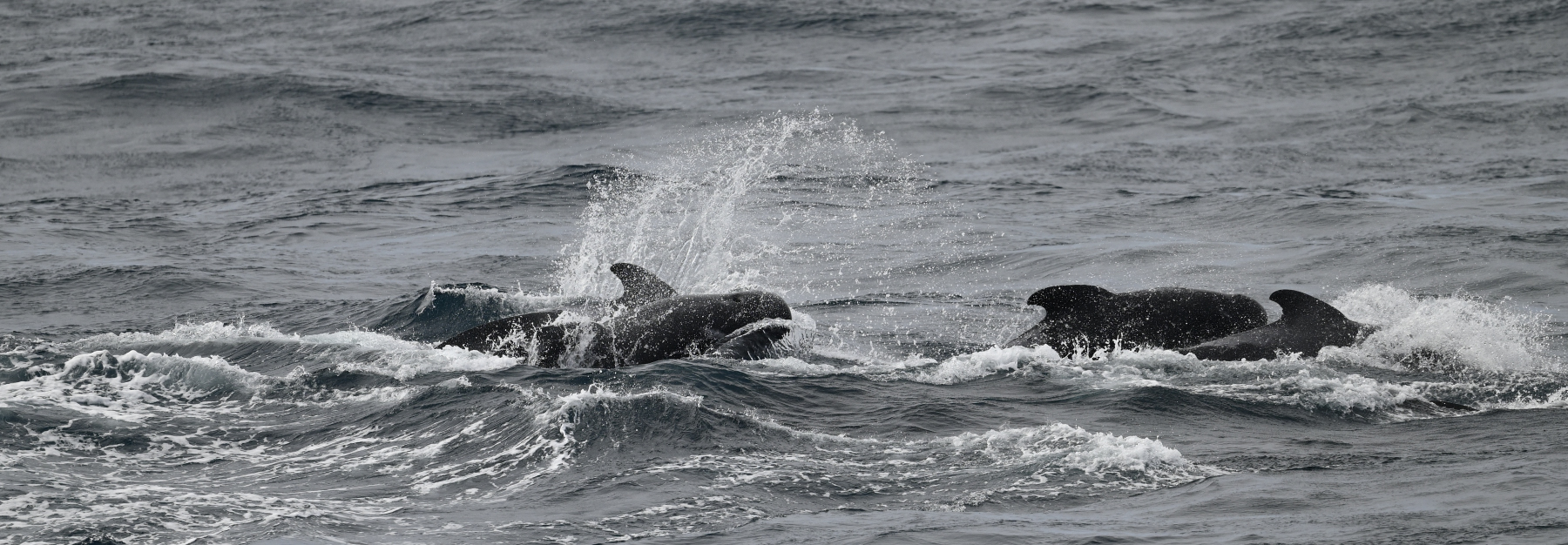 Wasser und Luft ca. 20°C, 700 Seemeilen vor Kapstadt, Kurs NW: Grindwale, zwei große Schulen! Rechts: leicht erkennbar an der Rückenfinne und dem runden Kopf. Die Weibchen haben ihre Kleinen in die Mitte genommen und schwimmen schnell... sie fliehen vor mehreren Orcas!
