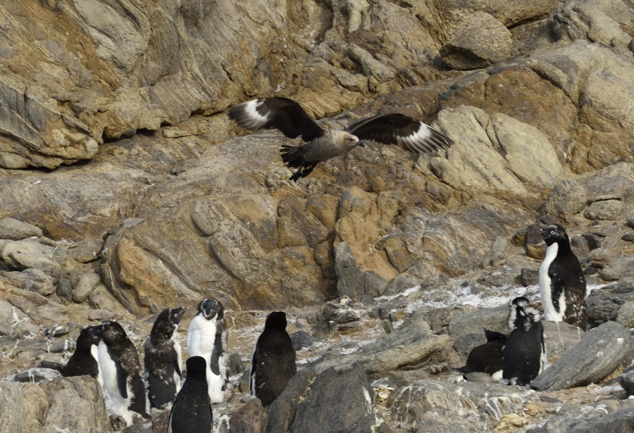 Skua Paradies, ein Paar "bewirtschaftet" etwa 1.-2.000 Adelie Paare hat man auf der antarktischen Halbinsel festgestellt. Die Skuas brauchen sich bloß bei den Pinguinküken zu bedienen, um ihre eigenen Junges (unten rechts) großzufüttern Fotos: AK