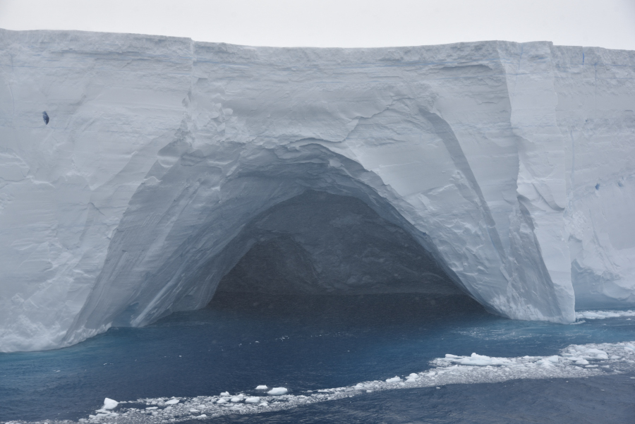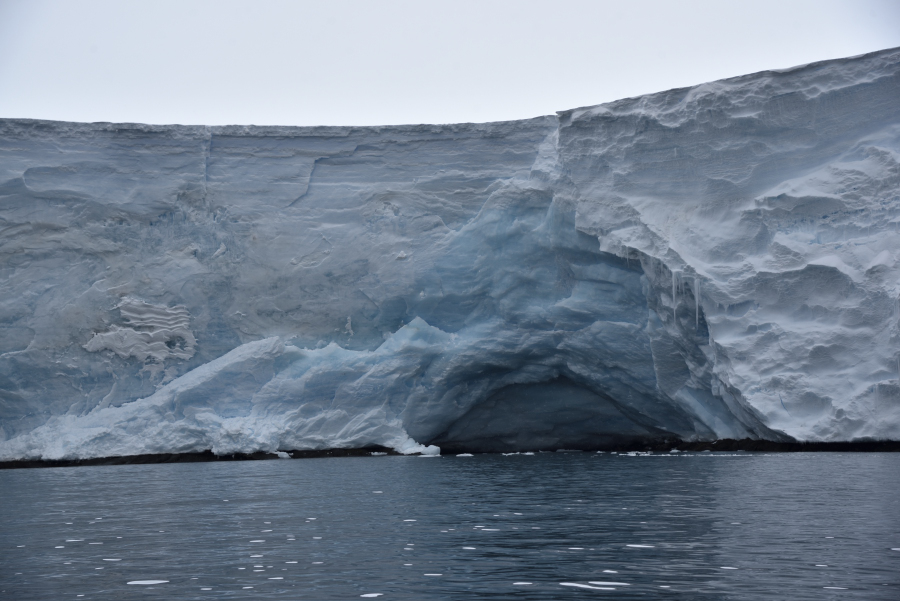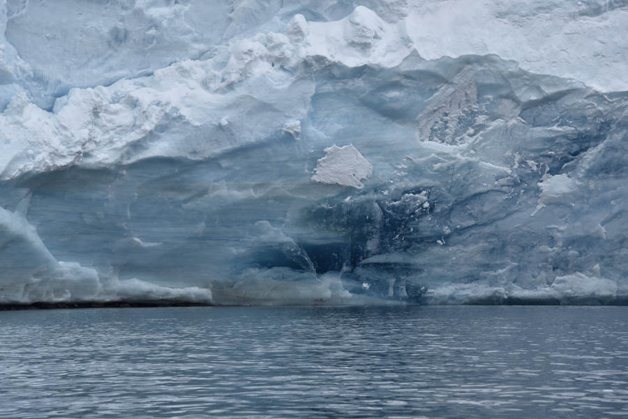 Die helle Abbruchstelle liegt rechts vom Gletschertor. Die sichtbare Höhe beträgt dort ca. 50 m, das bedeutet noch mind. 200 m unter Wasser, der Eisberg kippt nach vorn und löst eine 2,5 m hohen Welle aus, für die Charcot ohne Bedeutung, wohl aber für die Zodiacs, die solange im Inlet bleiben müssen, bis die Welle durchgelaufen ist. Rechnerisch ist das Volumen des Eisbergs 10x so groß wie das der Charcot.