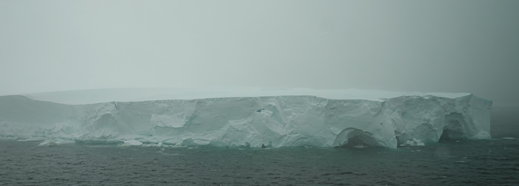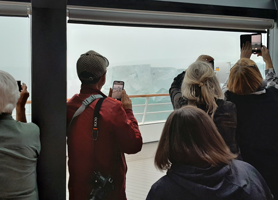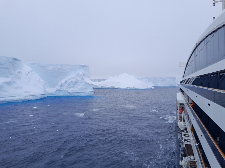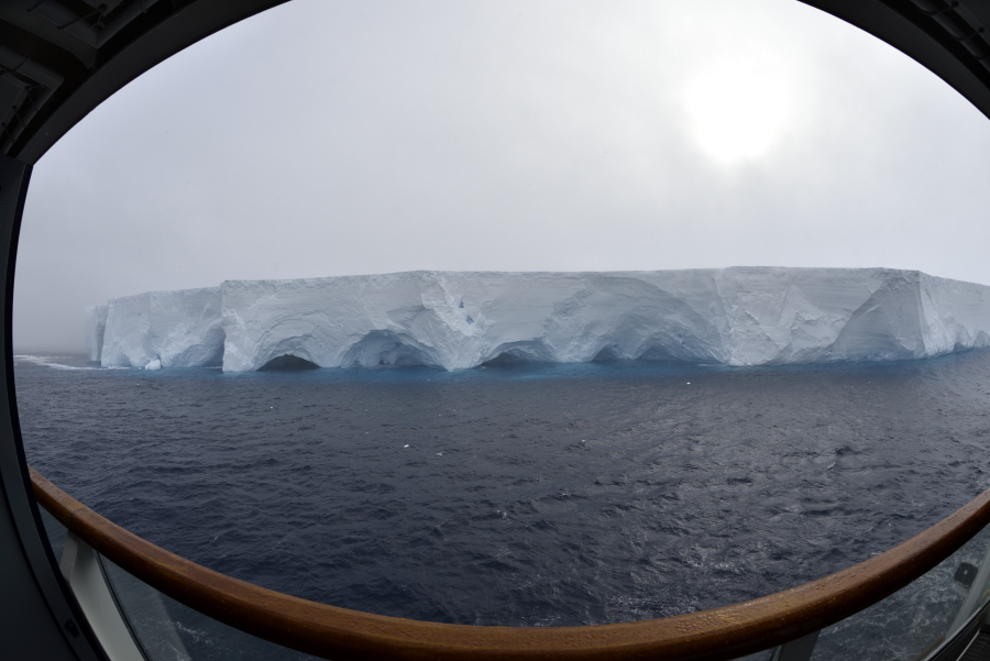 Mangels Sicht kann der Hubschrauber nicht fliegen. Er sollte uns einen Anlandeplatz am Gletscher ausmachen. Dort ist es aber total nebelig. Ausweichziel vormittags ist eine 5 x 7 km großer Eisberg, den wir in fahlem Sonnenschein halb umrunden. Da kann ich bequem von der Backbordkabine aus, auf dem Balkon sitzend, interessante Eisstrukturen fotografieren: