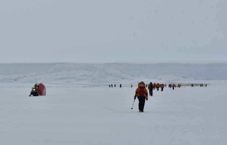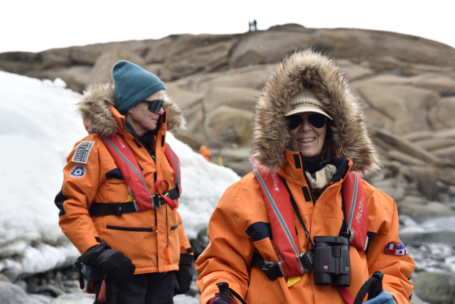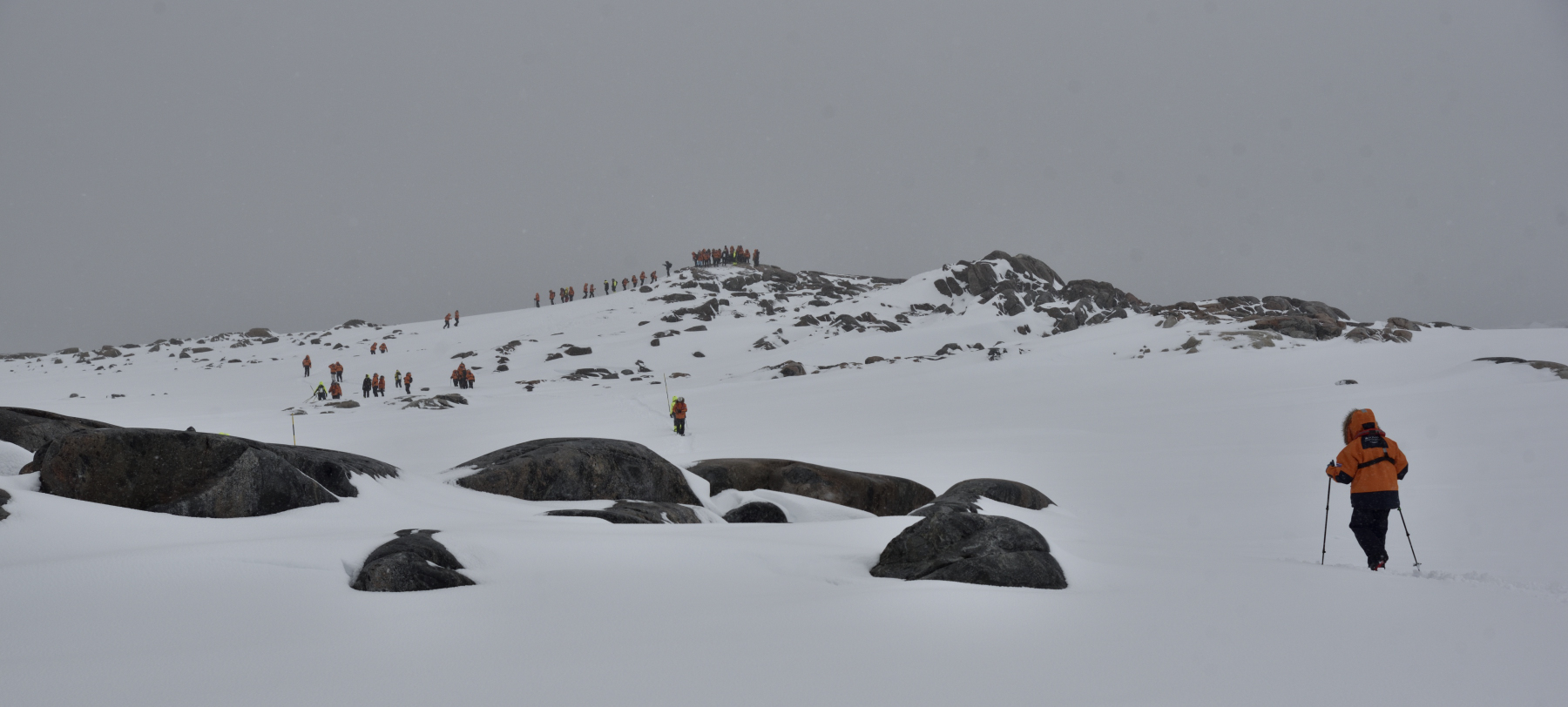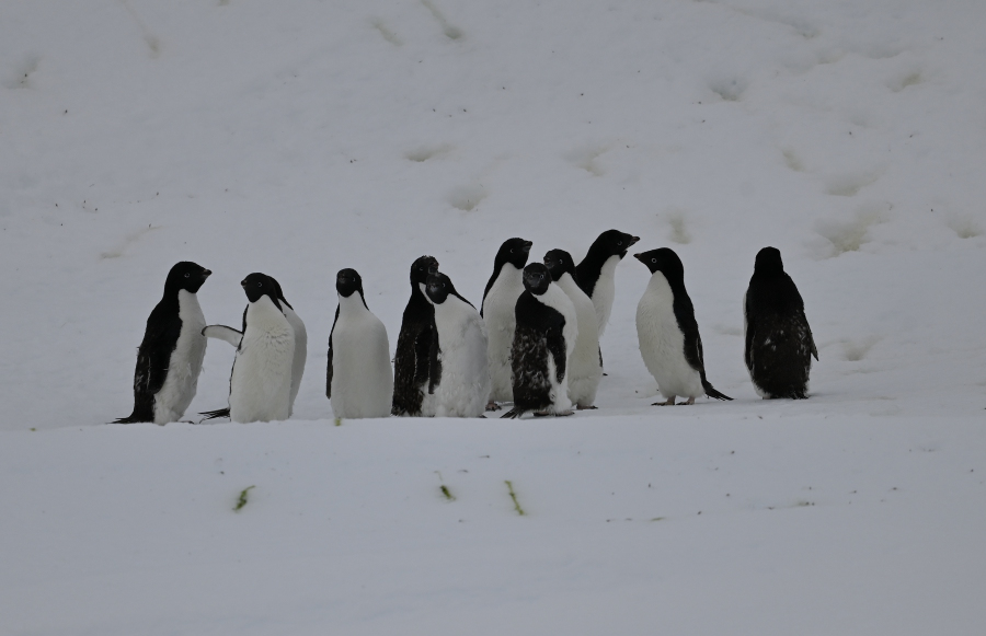 Wir stapfen durch den Schnee zum vermeintlichen Aussichtspunkt auf die Station Dumont d'Urville (DDU) auf der Nachbarinsel, aber der Schnee verhindert die Sicht weitgehend.
