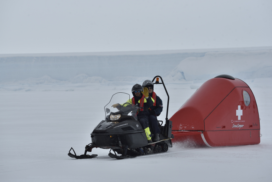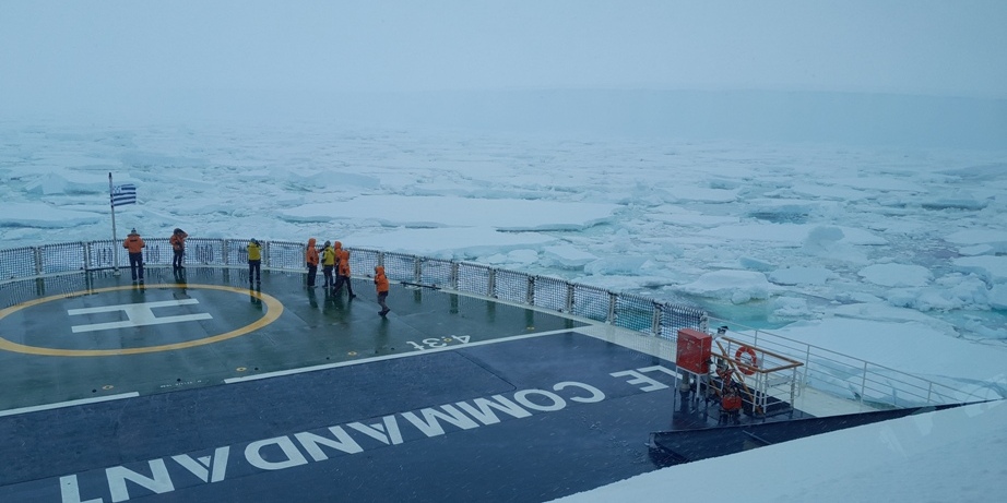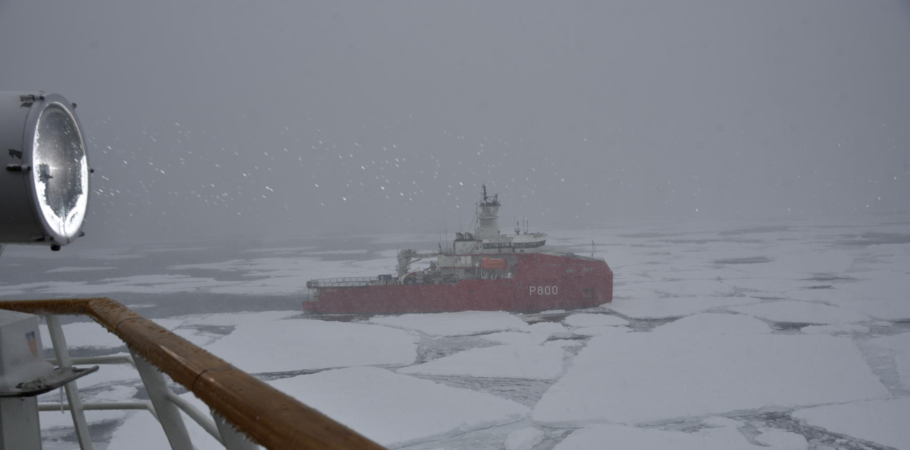 Nachmittags haben wir noch den Stationsleiter der DDU, Nicolas Puvis, an Bord, der über das Stationsleben berichtet: Heute war die letzte Versorgungsfahrt der Astrolabe für die nächsten acht Wintermonate dort angekommen und beide Schiffe begrüßen sich, die Kapitäne sind befreundet. Wir haben heftigen Schneefall und der Wind frischt auf.