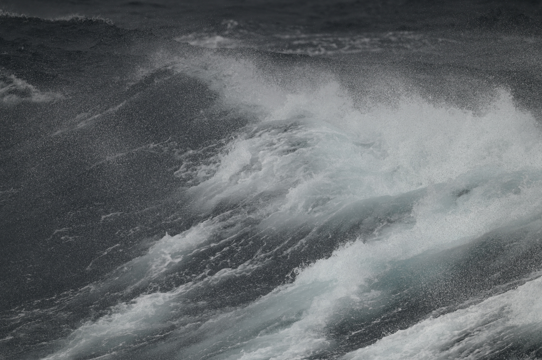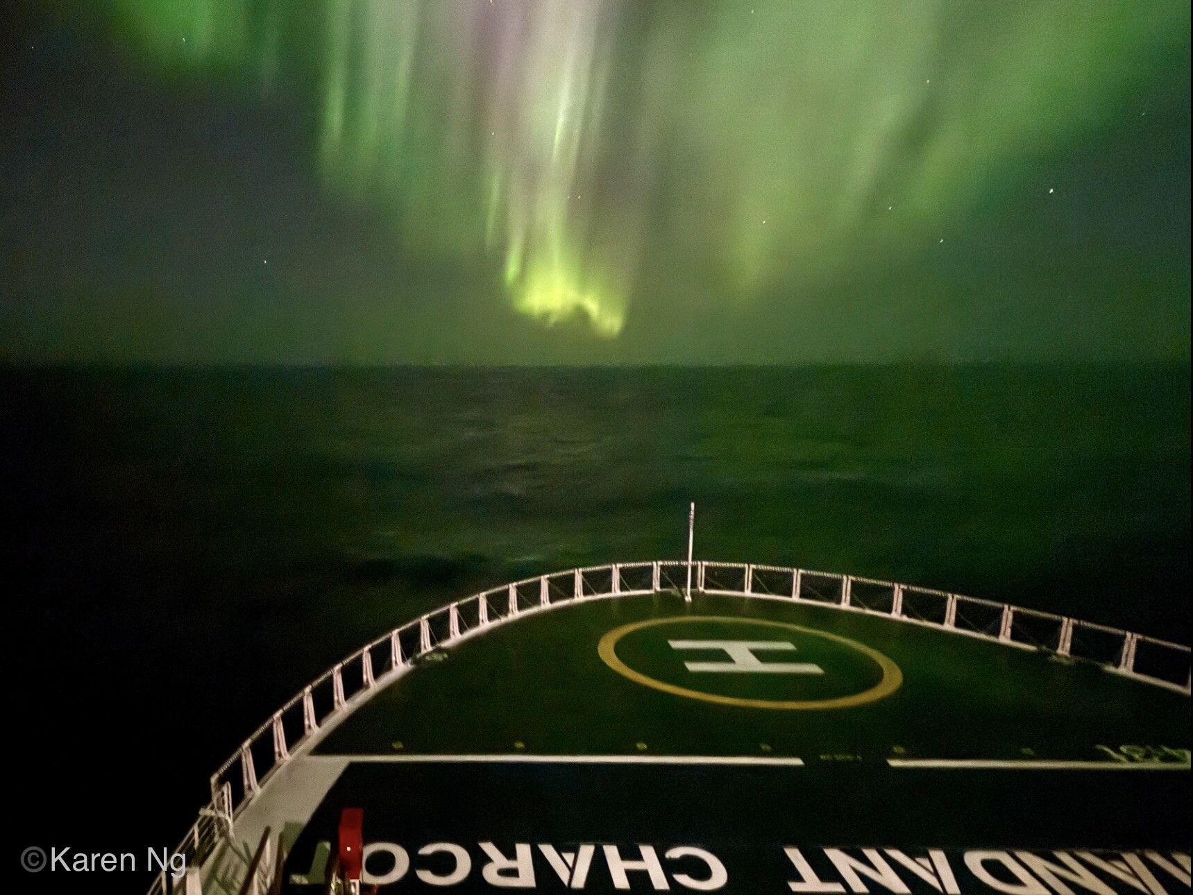 Überraschung abends um 22:10: während ich schon in Morpheus Armen liege, weckt mich Renate mit dem Satz, "der Kapitän hat gerade Polarlichter gemeldet." wir sehen sie weißlich durchs Balkonfenster. Raus können wir nicht, alles verrammelt. Der Kapitän stoppt das Schiff und Renate geht auf Deck 8 auf die Brücke. Zwischenzeitlich wird auf Deck 9 die Observation Lounge nach draußen geöffnet, was wir nicht wissen. Da hätte ich mein Stativ windgeschützt aufbauen können... Der Stopp bringt aber nicht viel, wir haben immer noch 3m Wellen, aber der Wind hat auf 5-6 Windstärken nachgelassen. Die Schiffsbewegung macht Stativfotos mit den erforderlichen 1-2 sec. schwierig. Aber immerhin unsere erste Aurora australis seit vielen Jahren...