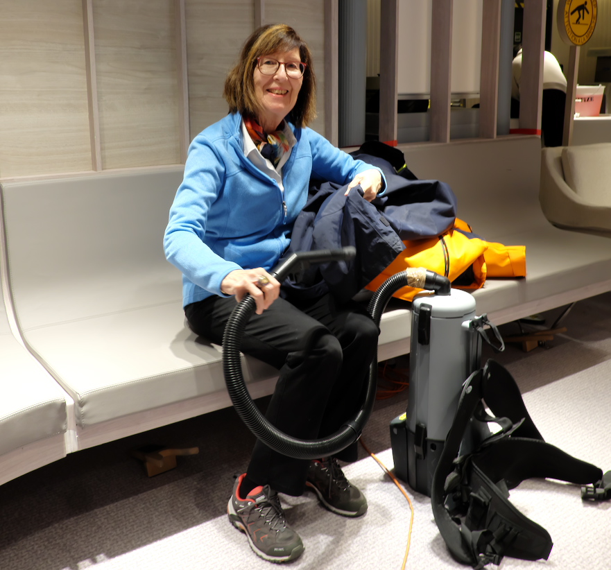 20.2.: Um 5 Uhr weckt mich ein roter Himmel. Für 5:27 ist der Sonnenaufgang am Informationsbildschirm angegeben. Wir sind mit guten 15 kn nach Süden unterwegs. Da die See deutlich ruhiger geworden ist, haben wir heute volles Programm. Vorstellung des Expeditionsteams, diverse Vorträge (Kapitän und EL erklären was sie vorhaben, aber alles wird am Eis und Wetter hängen), Stiefelausgabe und abends das verspätete Galadiner. Alle Fenster sind mit einer Salzkruste verschmiert, da ist in den nächsten Tagen für die Crew viel Arbeit angesagt: Brücke, Lounges auf 5 + 9, wie auch der Umlauf auf Deck 5 (330m für den Frühsport) müssen vom Salz befreit werden. Dann kommen die Kabinenfenster dran. Auch da gibt es eine Hierarchie: zuerst die Suiten... :-), Nein unser Steward reinigt das Kabinenfenster schon Mittags.