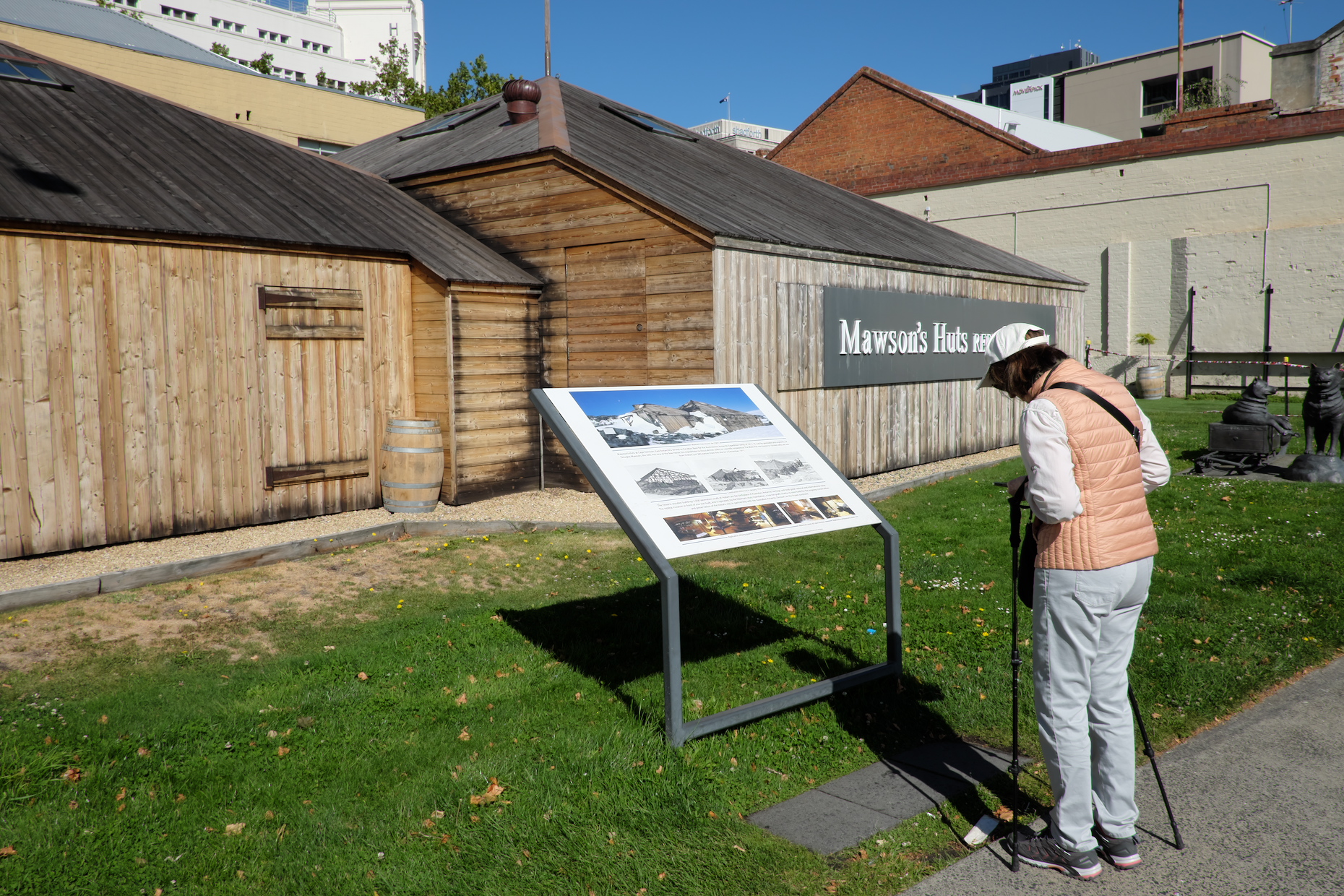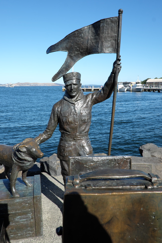 Louis Bernacchi, der tasmanische Fotograf auf Borchgrevink's und später auch Scott's Expeditionen steht in Bronze am Hafen. Mawson's Hütte als Replika nicht weit davon. Fotos AK
