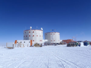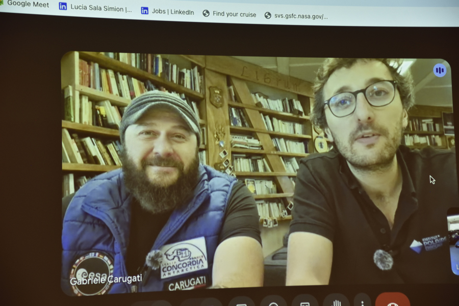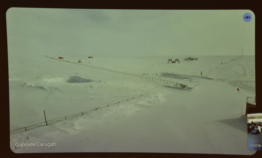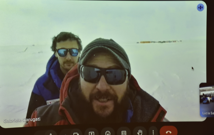 Lucia, Gabriele (Station Leader) and Doc Maxim live from Concordia to our ship. Fotos: 3x Concordia aus dem Netz, 3x AK von der Videoleinwand abfotografiert, einmal Portrait von Lucia.