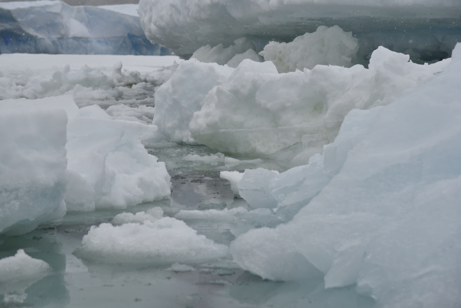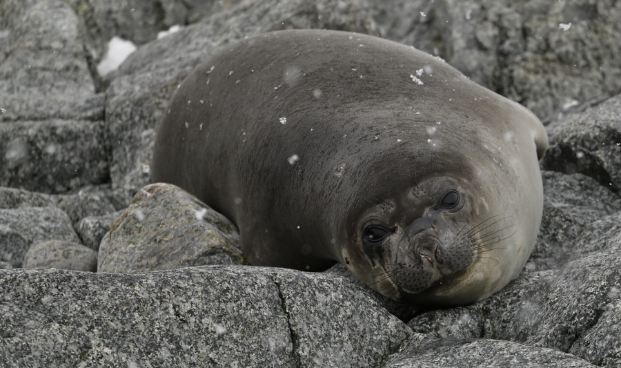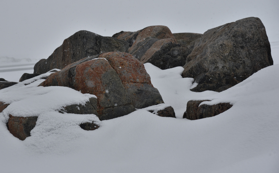 Nachmittags verlegen wir das Schiff um sechs sm nach Süden und setzen unseren Fuß erstmals auf dieser Reise auf den Antarktischen Kontinent. Die Küste der Browning Halbinsel besteht auch hier aus sehr altem, grobkörnigen Gneiss. Das Terrain ist uns zu steil und felsig und so beschließen wir nochmals eine Zodiactour zu initiieren. Hier haben wir zusätzlich noch eine Weddellrobbe, Seeelefanten und eine große, schon verlassene Adeliekolonie und den großen Vanderford Gletscher. Hier fällt uns sehr hartes Blaueis auf. Nachmittags fängt es wieder an zu schneien, aber wir sind auch fast zwei Stunden unterwegs.