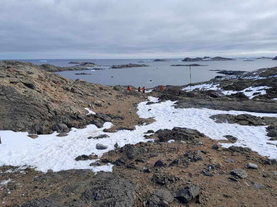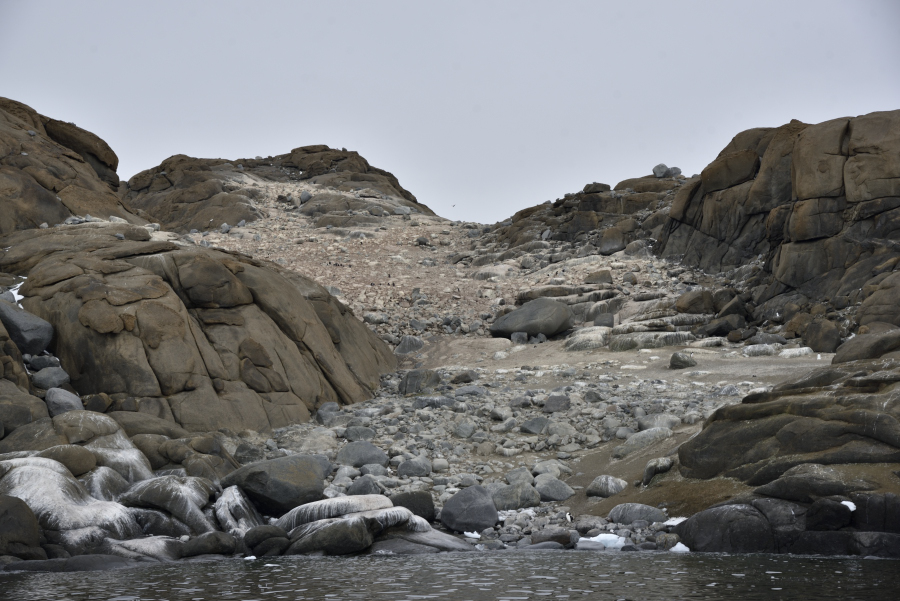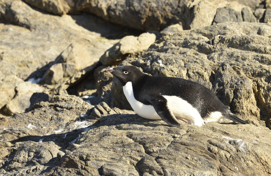 Vormittags gehen wir als letzte Gruppe auf die Zolotov Insel an Land, die eine große Adelie Kolonie beherbergt hat, die meisten sind nun weg oder mausern. Es gibt zwei Wege: links den Berg rauf geht Renate, fit nach neuem Sportprogramm und geradeaus zur anderen Seite der Insel "läuft" Achim.