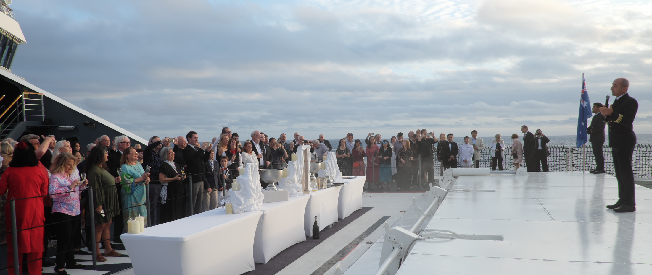 16.3.: Farewell Party auf dem Helideck: Kapitän Devorsine hält eine Ansprache. Nachmittags um 16:00 laufen wir ein: