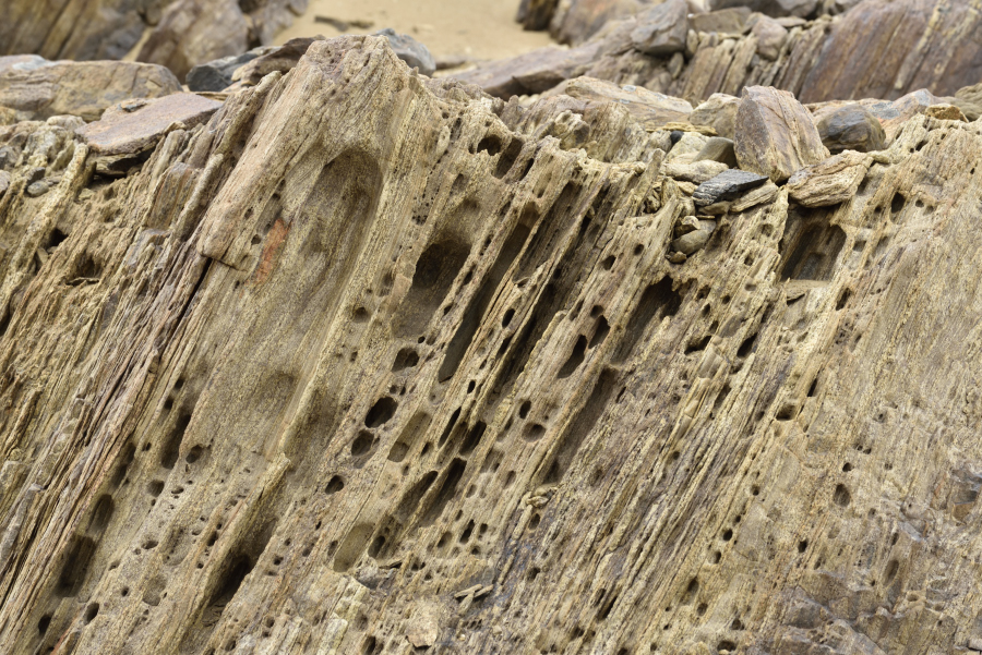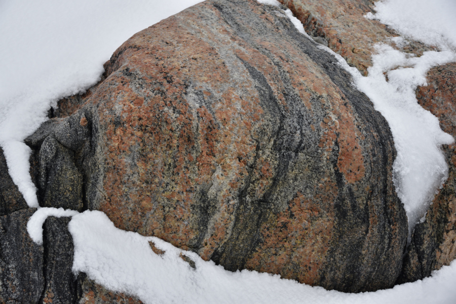 Der Gneiss auf der Insel ist grobkörnig, eisenhaltig und etwa 1,7 Milliarden Jahre alt. Damit dürfte es sich um einen Urkraton ("Miniplatte") handeln, der sich an die Antarktis angelagert hat. Fotos: AK