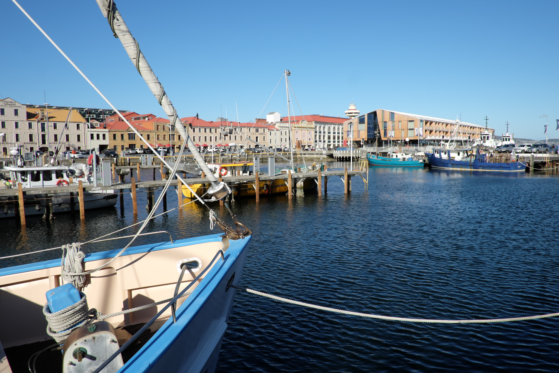 15.-16.2.: In Hobart haben wirt tolles Wetter: Sonne und 21-25°C: nach Dusche und 3h Schlaf gehen wir was essen und schlafen dann von 21 Uhr bis 8:30 morgens durch. Um 10:00 starten wir die Museumstour. Erst zur Replika der Mawson Hütte, so wie sie auch restauriert in der Antarktis steht, dann ins Tasman Museum & Art Gallery zur Antarktis Ausstellung und zur Tasmanischen Uni am Hafen, die dort seit 2011 ein großes Institut IMAS (centre of excellence: institute for marine and Antarctic studies) für Antarktisforschung betreiben. Ein sehr großzügiger Neubau!