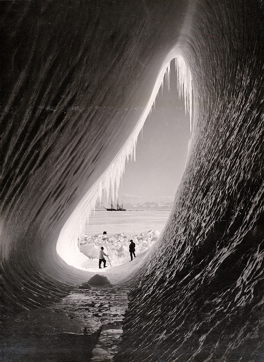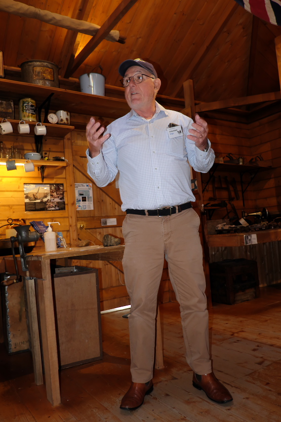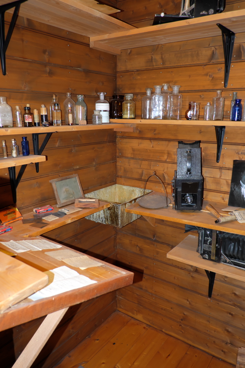 Rags, ein pensionierter Mitarbeiter des Australian Antarctic Survey, erklärt uns Mawsons Hütte und das Leben der 18 Expeditionsteilnehmer in dieser Enge und Kälte. Mitte: Blick in die 1,5 qm große Dunkelkammer Frank Hurleys (1911-14), der solche ikonischen Fotos auf Glasplatten von der Shackleton Expedition (1914-15) aus der Antarktis mitgebracht hat. Die hier gezeigten Kameras sind Laufboden- und Reflextypen aus den >1920er Jahren. Fotos: links und Mitte AK, rechts Frank Hurley