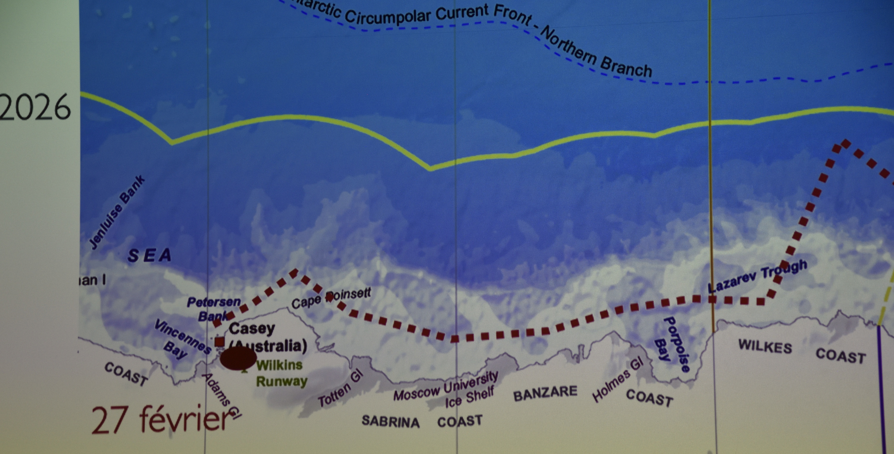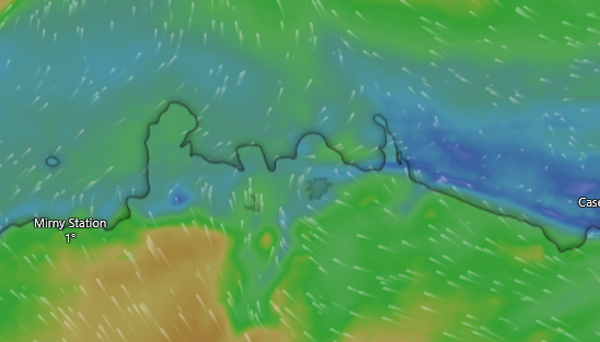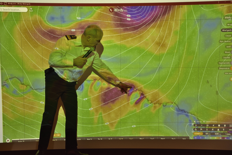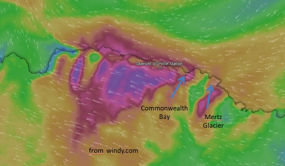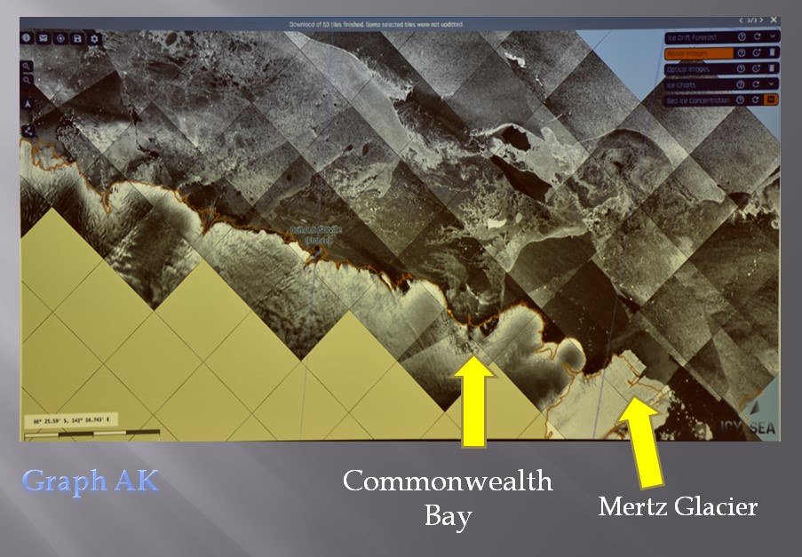 Der Kapitän erklärte in seinem Vortrag, wie schwierig es sei, die Eiskarten zu lesen: sie sind mindestens ein paar Stunden alt, große Eisplatten lassen sich gut erkennen, aber in der Commonwealth Bay scheinen die Verhältnisse zwischen Fest- und Treibeis unklar. Der Wind (rechts) spielt auch eine große Rolle: er treibt das Treibeis. Bei der französischen Forschungsstation Dumont d'Urville pfeift es aktuell ganz gut bis zum Montag.