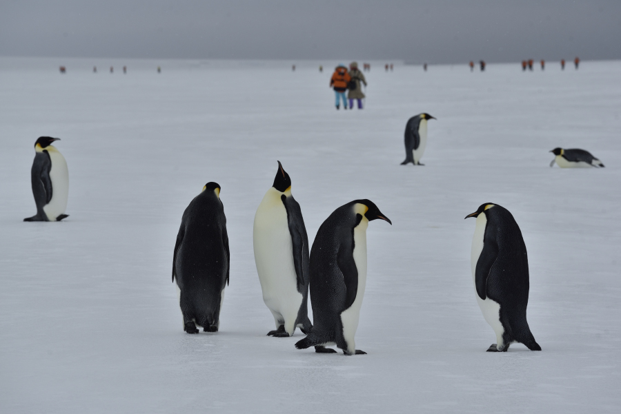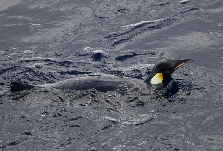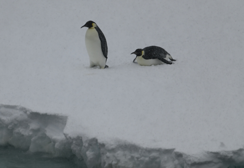 Bis hierhin und nicht weiter, der Kapitän dreht ab, damit wir uns hier nicht selbst in eine schwierige Situation bringen, es gäbe keine Hilfe, keinen größeren Eisbrecher, der uns freischleppen könnte. Kein unnützes Risiko eingehen! Foto: RK von der Brücke aus Den Kaiserpinguinen ist es egal, sie lieben die Eisschollen als Mauserplatz. Foto: AK