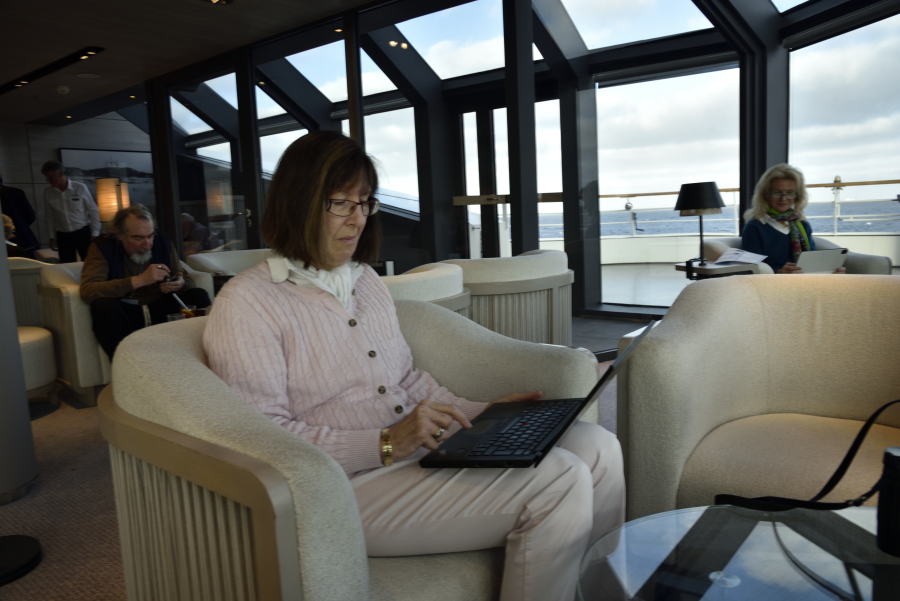Mein "Arbeitsplatz" in der Observation Lounge auf Deck 9: Laptop, Renates wertvolles Notizbüchlein, Kameras und warme Jacke immer griffbereit, in Sekunden bin ich draußen, wenn's was zu sehen gibt.