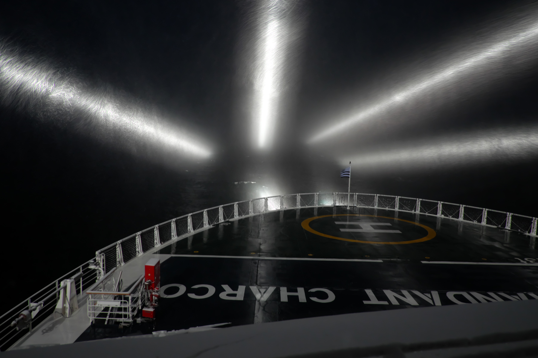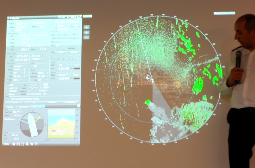 Bei Nacht: 6 Offiziere auf der Brücke und 6 Superscheinwerfer, die besonders das Eis aufleuchten lassen, sind nötig nachts bei so einem Sauwetter sicher zu navigieren: "gefährlich" sind größere Eisgrowler (so groß wie eine Garage) die kaum aus dem Wasser ragen und vom Radar nicht erfaßt werden können. Wenn wir die Midships erwischen, tut es einen dicken Bums und alle sind wach. Dem Schiff passiert nichts, in den Kabinen hört man das aber bis zum Heck, wo wir wohnen.