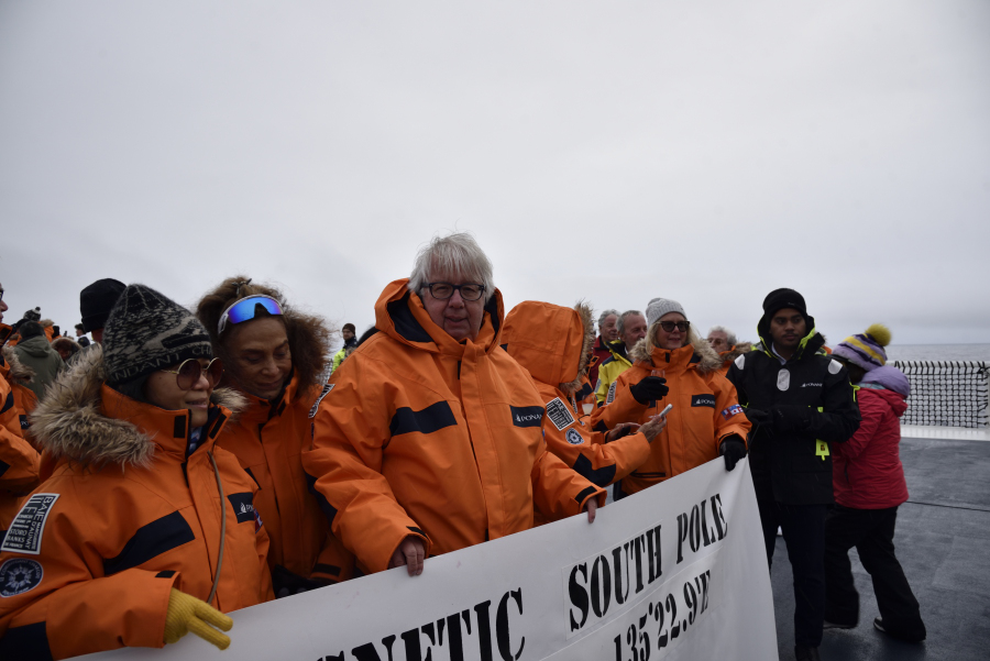 24.2.: Wir sind auf dem Weg zum südlichen Magnetpol, den wir zum Abendessen erreichen sollen. Der Kapitän berichtet gerade, dass der Magnetkompass schon zu spinnen anfängt. Kreiselkompass und GPS funktionieren natürlich. Gegen 19:15 wird dieses Ziel auf dem Helideck begossen werden.
