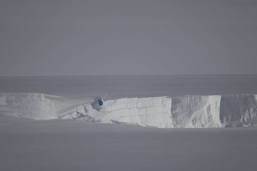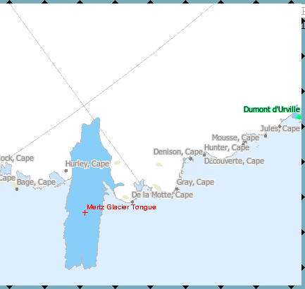 17:30 wir erreichen den Mertz Gletscher. Die Gletscherzunge ist 80 km lang und 24 km breit. Die sichtbare Höhe beträgt 40-45m. Wir fahren in einen "Fjord"/Grabenbruch (engl. Rift) in der Mitte der Gletscherzunge ein, die schon kartografiert ist. Da kommen wir aber wegen dichtem Packeis auch nicht weiter.