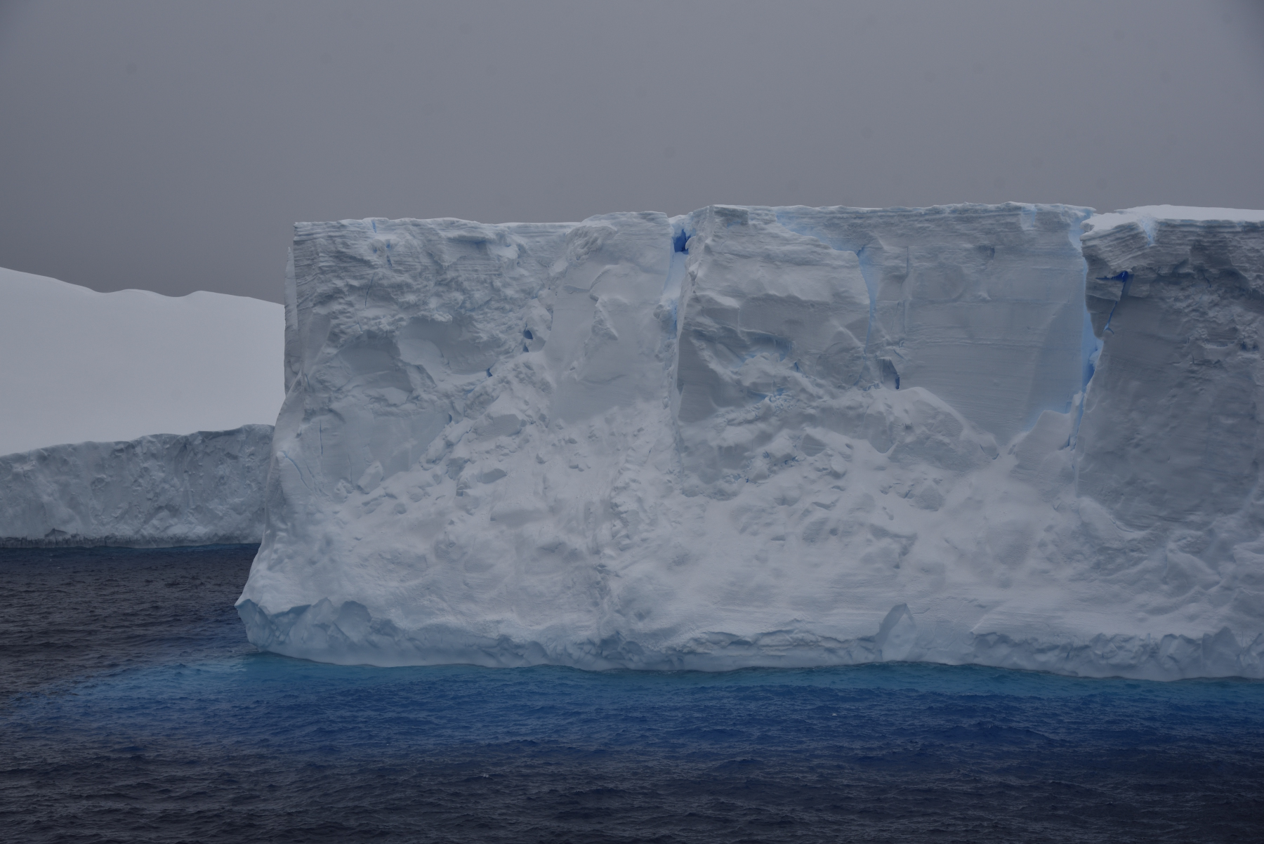 23.2.: Unser Weg zurück zur Commonwealth Bay wird durch eine unendliche Kette riesiger Eisberge begleitet. Die kommen vielleicht vom Mertz- und Ninnis Gletscher oder vom Cook Eisschelf.