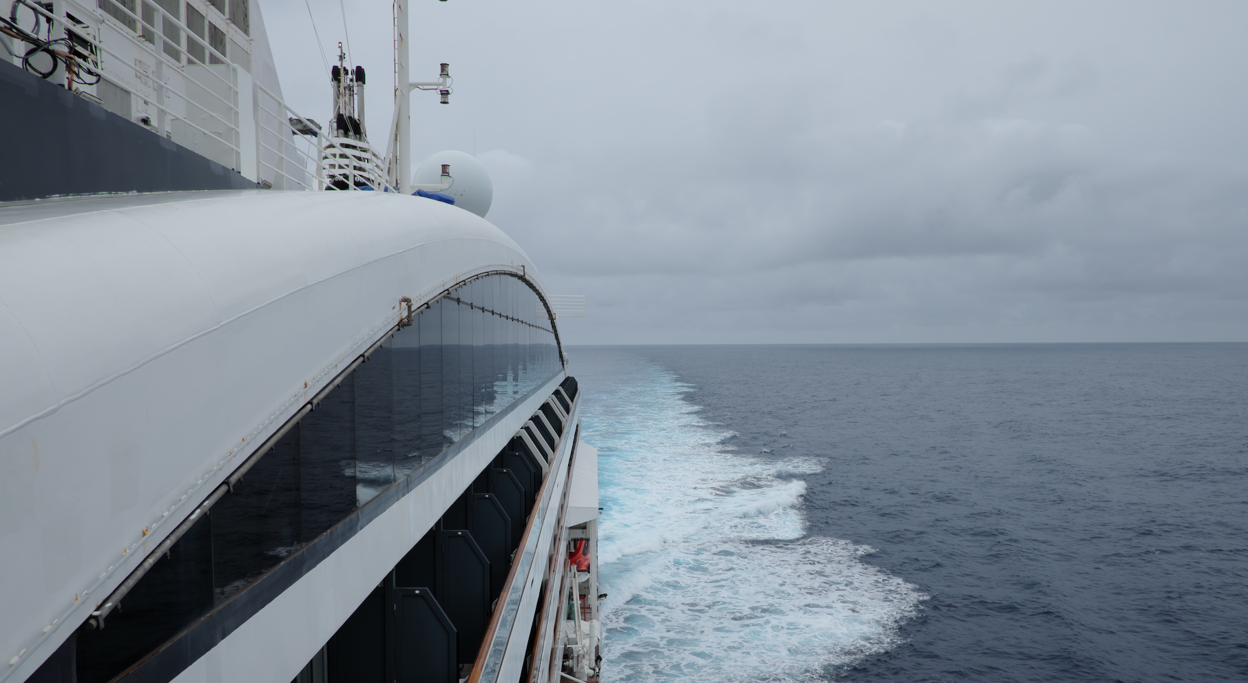 Sieht erstmal harmlos aus von Deck 5, aber zwischen den 5 Meterwellen kommt dann auch immer mal was Größeres. Das hat uns beim Lunch auf Deck 9 die Teller vom Tisch gewischt und der Swimming Pool ist auch übergelaufen... Fotos: AK