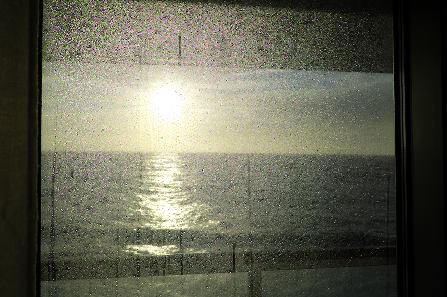 Fotografenpech: schöne Wolken durchs Salzfenster, Salz überall, bis in die äußersten Ecken... Und die Außentüren sind immer noch verrammelt! Der Kapitän sprach in diesem Zusammenhang vom "eingesperrt sein", zu Recht.