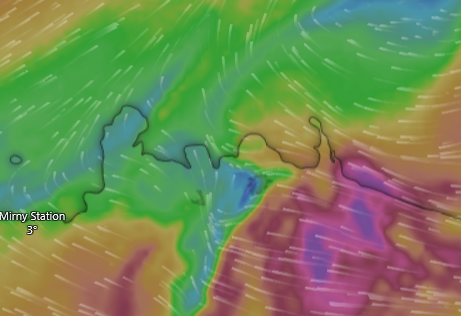 Das Wetter diktiert derzeit unsere gesamt Reise: links - heute liegt der Sturm hinter uns und hat die Station Casey fest im Griff. Bei uns bläst es aber derzeit (18:00) auch mit >50kn. Mitte: Morgen wird es am Westrand des Schelfs günstig sein - nur 5-10kn Wind. Rechts: Übermorgen bleibt es ruhig, aber da müssen wir schon wieder weiter sein...