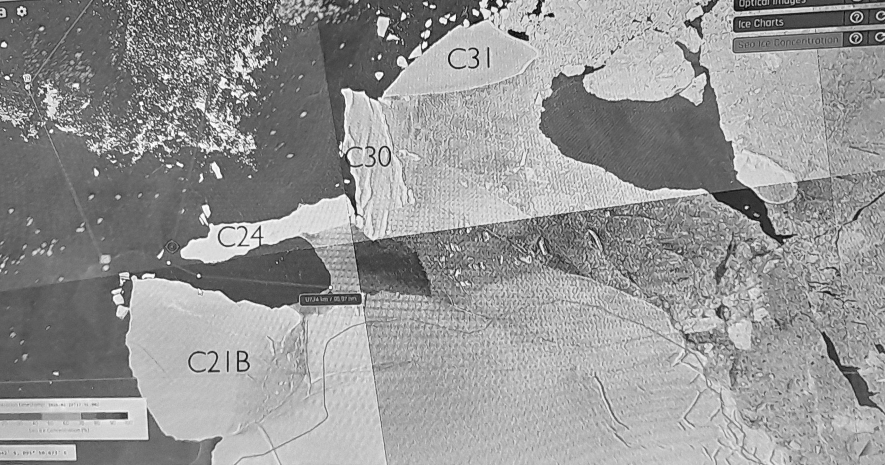 Alles gelaufen: der Eisberg hat Grund in etwa 500 m Abstand, bevor er uns den geloteten Kurs (rote Linien auf dem Radarbild) kreuzen kann. Das ganze Gebiet war bislang unkartiert. So können wir auf der roten Kurslinie problemlos zurückfahren.