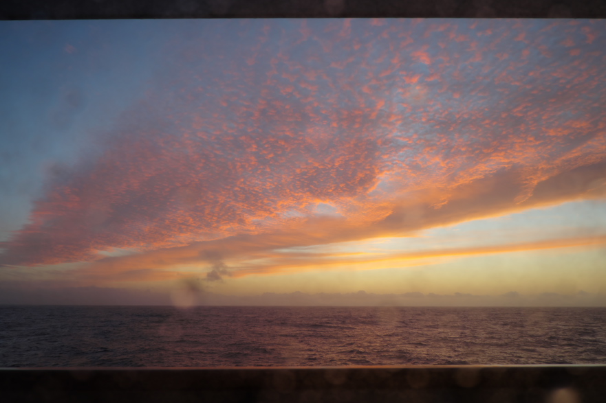 Man glaubt es kaum: 20:30 kommt die Sonne kurz raus. Jede Menge Wetter auf dieser Überfahrt. Foto: AK mit Samsung Galaxy durch die Scheibe der Lounge auf Deck 9
