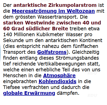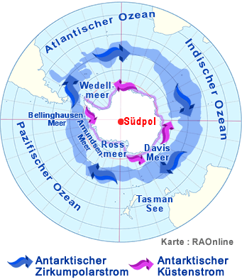 19.2.: Diese Nacht stellen wir die Uhren eine Stunde zurück. Wir sind morgens bei 51°S und damit in den "Furious Fifties" unterwegs. Das Wetter bietet immer den gleichen Wind aus der südpolaren Zirkulation (dunkelblau), die im Uhrzeiger Sinn um die Antarktis bläst und so eine gigantische Meeresströmung induziert: