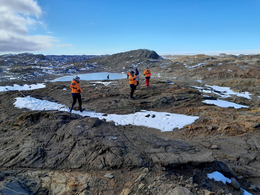 Oben: vom Gletscher glatt gefegte Hochebene. An tieferen Stellen bleiben flache Seen zurück. Auch sog. "Dykes" sind zu bewundern: dort sind in Risse flüssige Lava eingedrungen und färbte die dünne Schicht dunkelgrau bis schwarz. Das ist alles metamorphes Sediment oder Gneiss. Geschichtet, gekippt und stellenweise wie "Schweizer-Käse" durchlöchert, sog. Tafoni, was durch Erosion entstanden ist. Zeit genug war ja dafür: 1,1 - 2 Mrd. Jahre. Fotos: 3x AK, 2x RK