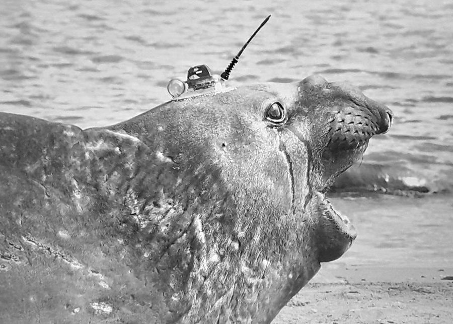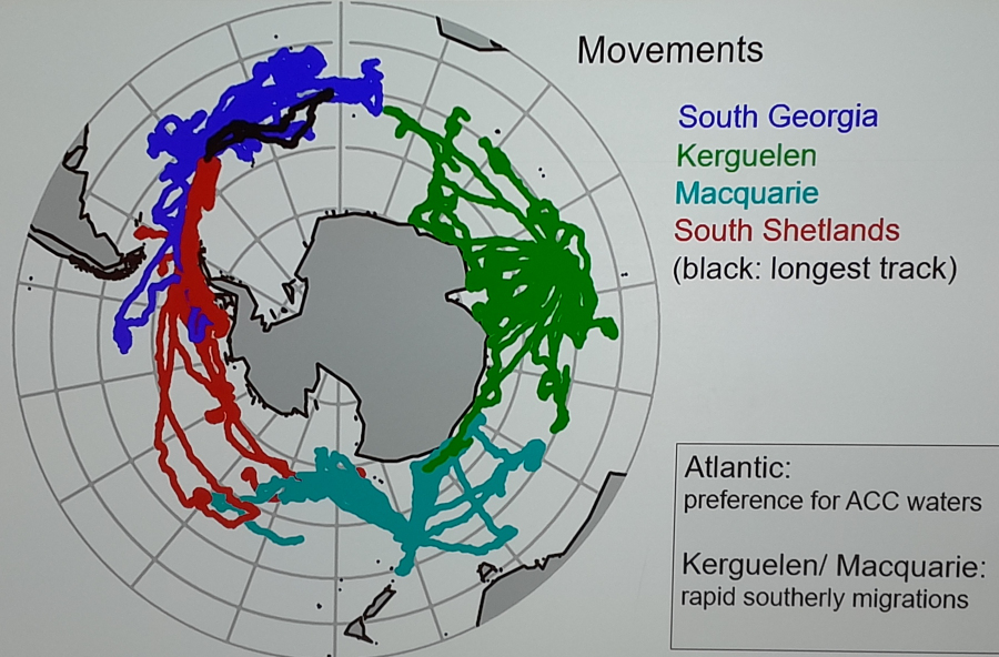 Petra zeigte im Recap einen Sender markierten Seeelefanten: der Sender fällt beim nächsten Fellwechsel von selbst ab. Und rechts die vom Satelliten aufgezeichneten Wanderungen von den verschiedenen Brutplätzen.