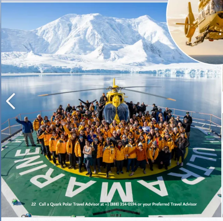 Fotosituation auf dem Eis vor Snow Hill Island: Wegen der Gefahr der Übertragung der Vogelgrippe darf man sich aktuell weder in den Schnee setzen und schon gar nicht legen. Stativ und Hocker sind erlaubt. Auch der Rucksack hängt am Stativ oder bleibt auf dem Rücken. Nach dem Landgang werden Stiefel, Stöcke, Stative usw, also alles was den Boden berührt hat, mit Vircon (R) desinfiziert. Alle Gäste und auch das Personal haben sich strikt daran gehalten! Foto © Renate Kostrzewa (17.11.23) Rechts: Wir finden uns im Reisekatalog von Quark Winter 25/26 wieder: ganz links außen zusammen mit Shane Evoy, unserem Expedition Leader. Foto: © Quark: Wir wünschen der Crew der Ultramarine für den November 25 gutes Gelingen beim erneuten Besuch von Snow Hills Kaiserpinguinen. Wir haben schon eine Buchung für die Ostantarktis auf der Charcot für Mitte Feb.26 von Hobart nach Kapstadt...