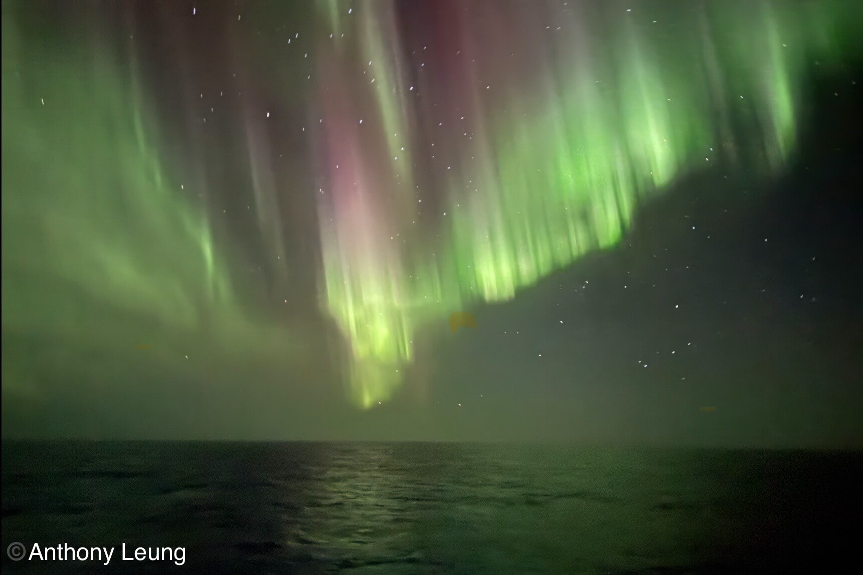 Überraschung abends um 22:10: während ich schon in Morpheus Armen liege, weckt mich Renate mit dem Satz, "der Kapitän hat gerade Polarlichter gemeldet." wir sehen sie weißlich durchs Balkonfenster. Raus können wir nicht, alles verrammelt. Der Kapitän stoppt das Schiff und Renate geht auf Deck 8 auf die Brücke. Zwischenzeitlich wird auf Deck 9 die Observation Lounge nach draußen geöffnet, was wir nicht wissen. Da hätte ich mein Stativ windgeschützt aufbauen können... Der Stopp bringt aber nicht viel, wir haben immer noch 3m Wellen, aber der Wind hat auf 5-6 Windstärken nachgelassen. Die Schiffsbewegung macht Stativfotos mit den erforderlichen 1-2 sec. schwierig. Aber immerhin unsere erste Aurora australis seit vielen Jahren...