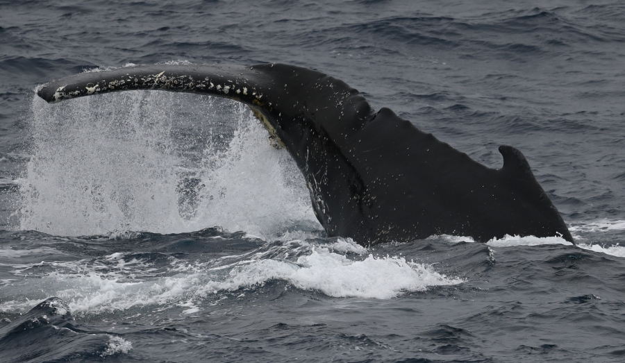 Buckelwale jagen auf Steuerbord neben dem Schiff: (oben, links) sieht man eher selten: die warzige Schnauze. Warum der eine (unten) mit dem Schwanz aufs Wasser schlägt, ist nicht ganz klar. Fotos: AK
